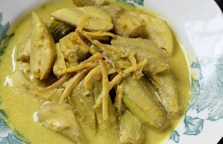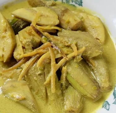 Pisang yang digunakan ialah pisang muda, bukan pisang masak. Tekstur dia lebih keras sikit, tak manis, dan bila dimasak, dia jadi lembut serta mudah serap kuah. Inilah yang buat gulai ni sedap setiap potongan pisang tu penuh dengan rasa lemak santan dan rempah.